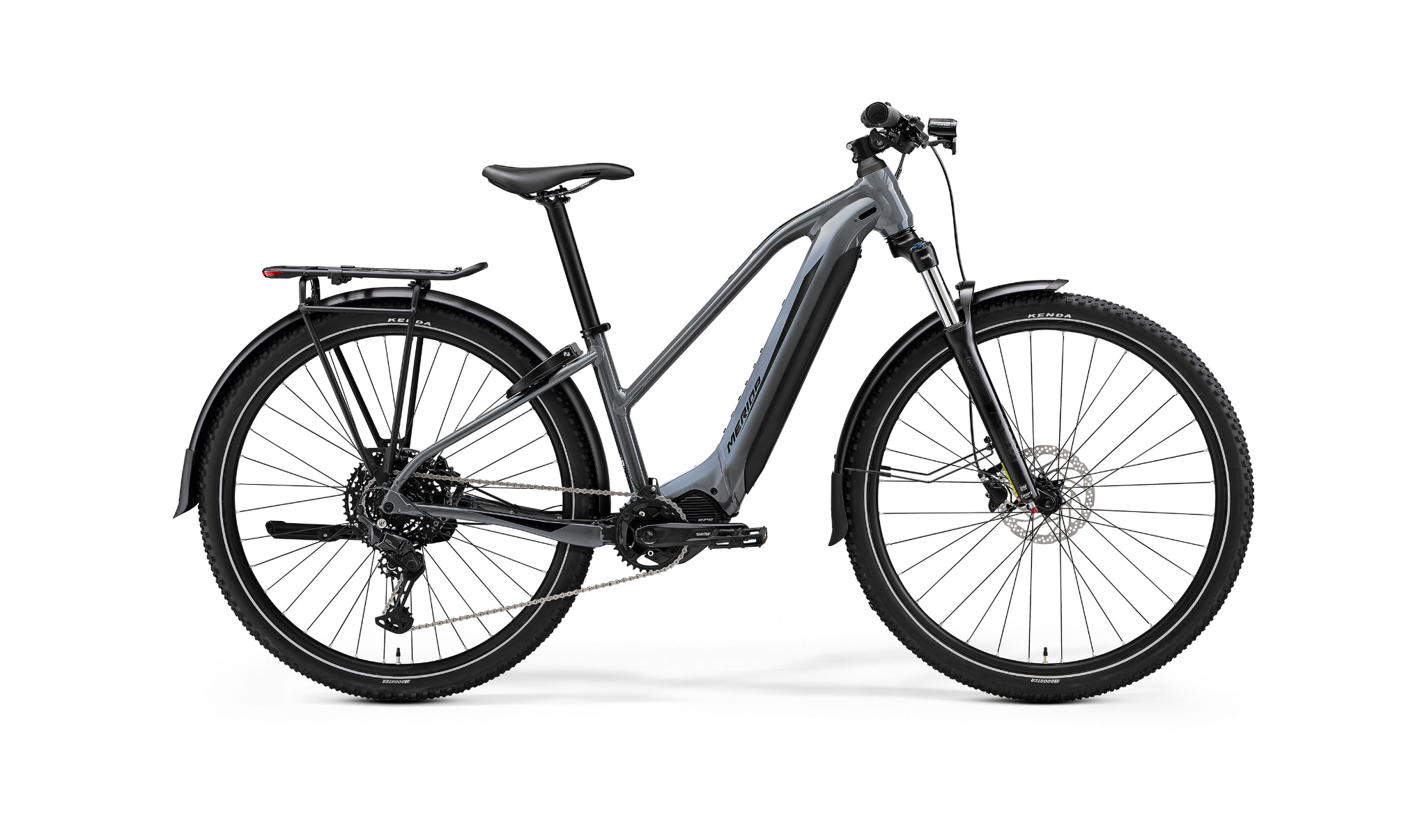 Przypomina rower górski, ale drzemie w nim prawdziwie turystyczny potencjał. Merida eBig. Tour EQ to elektryczny rower trekkingowy z amortyzowanym widelcem i oponami MTB 29”, dzięki czemu zapewnia większy komfort niż klasyczny rower trekkingowy. Błotniki, bagażnik i światła dają mu jednak turystyczną funkcjonalność. Merida eBig. Tour 400 EQ ma mocną i sztywną aluminiową ramę Lite z wewnętrznym prowadzeniem przewodów dla ich ochrony przed brudem i wilgocią oraz stożkową główką ramy dla precyzyjnego prowadzenia. Mocno gięta dolna rura ułatwia zsiadanie z roweru, choćby dla zachwytów widokami na trasie. Rower ma mocny silnik Shimano EP6 (85 Nm) oraz zintegrowaną baterię Shimano o poj. 630 Wh, która pozwoli Ci pokonać więcej km na jednym ładowaniu. Odpowiedni zakres przełożeń zapewni osprzęt Shimano 1 x 10 z przerzutką Shimano CUES, a odpowiednią amortyzację przedni amortyzator SR Suntour XCM34-Boost LOR DS. Dzięki oponom Kenda Booster możesz liczyć na niskie opory toczenia i dużą przyczepność. Twoje bezpieczeństwo poprawi mocne oświetlenie Lezyne i Spanninga montowane w eBig. Tourze. Docenisz również koła Merida Comp CC II z piastami w standardzie Boost, które zwiększają sztywność boczną i wzmacniają koło, 2-tłoczkowe hydrauliczne hamulce tarczowe Shimano MT200 oraz komponenty Merida. Rama jest wyposażona w bagażnik, błotniki i stopkę. Daje też możliwość przymocowania koszyka bidonu, rowerowego zapięcia czy pompki. Wszechstronność tego e-bike’a zaskoczy Cię. Merida eBig. Tour 400 EQ umili Twoje wycieczki, a jeśli będziesz chciał wybrać skrót w terenie, nie będzie z tym problemu. Zapewnij sobie mocne wsparcie na wielu trasach!
